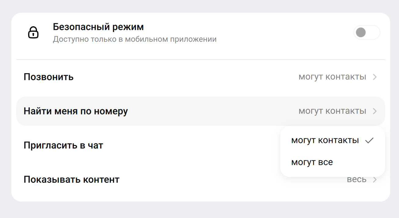 Кроме того, в MAX есть отдельные настройки безопасности, которые позволяют ограничить возможность находить профиль по номеру телефона. Если пользователь включил такие ограничения, найти его или увидеть связь профиля с номером телефона становится сложнее.