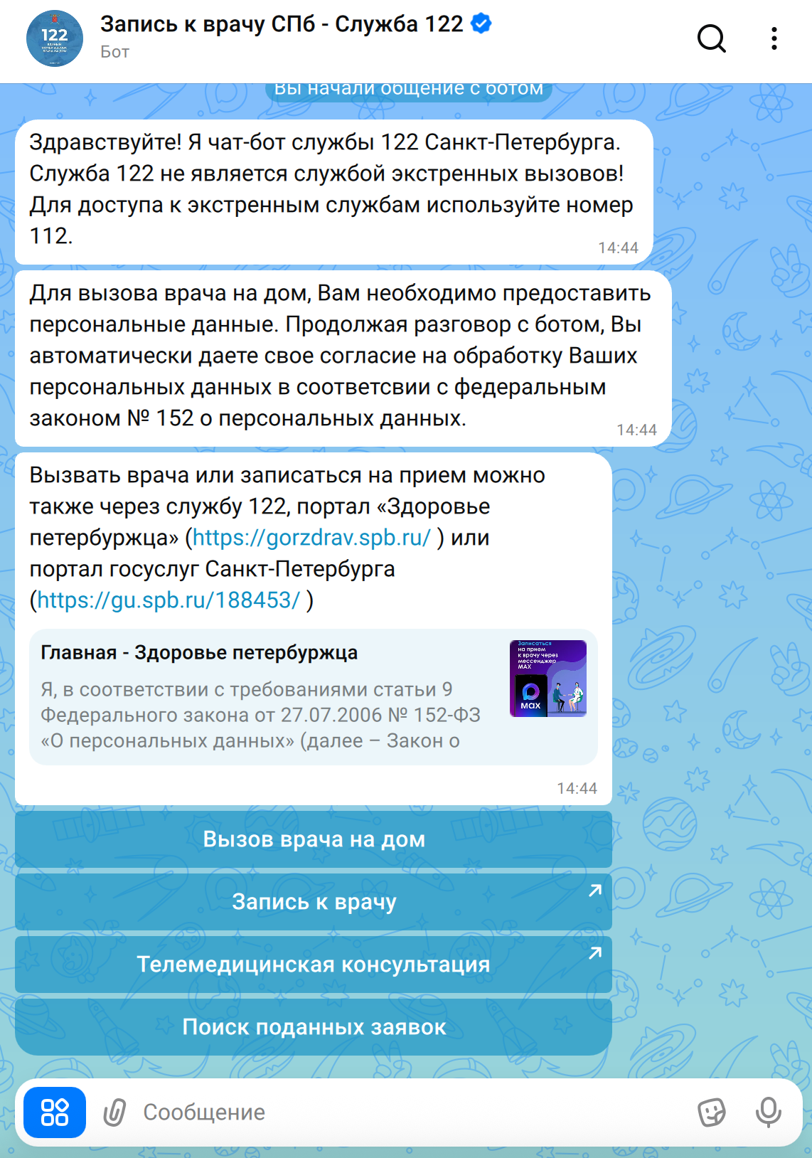 Шаг 1. Откройте бота «Служба 122 СПб»